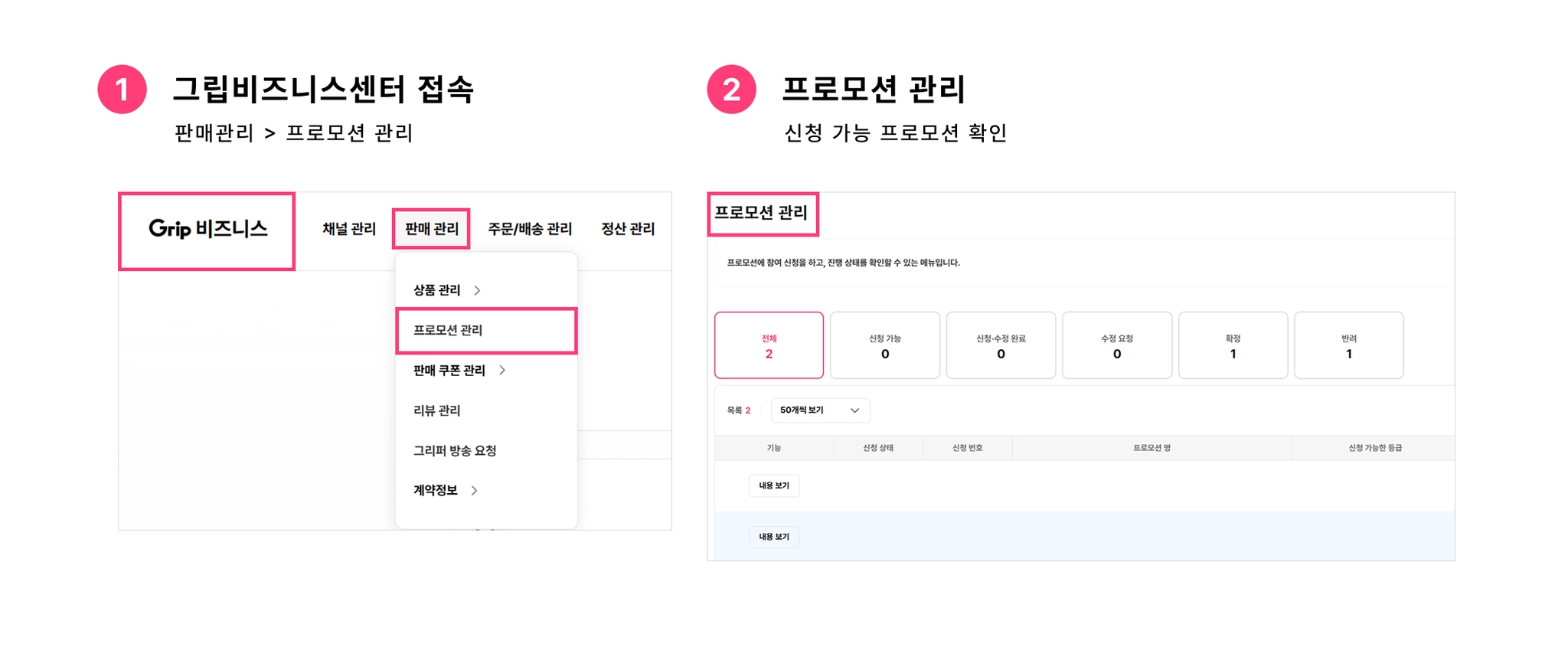 비즈니스센터 홈 화면과 [판매 관리 > 프로모션 관리] 에서 프로모션 내용 확인 후 참여 가능한 프로모션에 신청하실 수 있습니다.