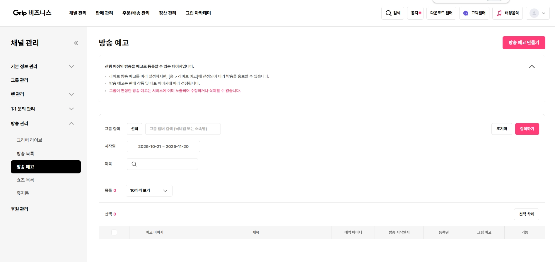 경로 : 비즈니스센터 > 채널 관리 > 방송 관리 > 방송 예고 > 우측 상단 방송 예고 만들기