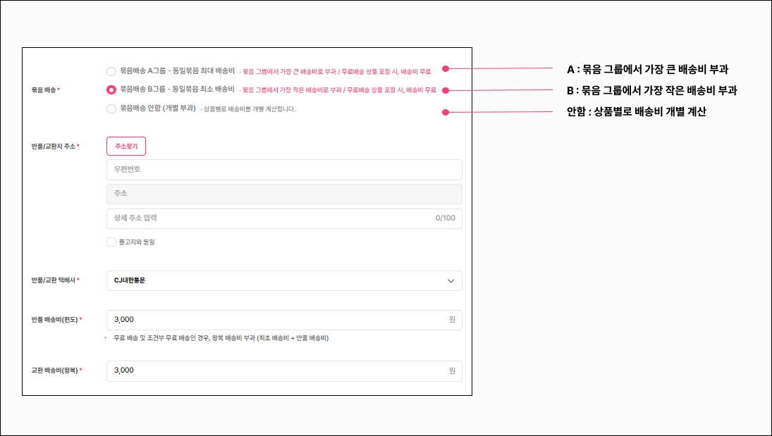 묶음배송 B : 묶음 그룹 내 가장 작은 배송비 부과