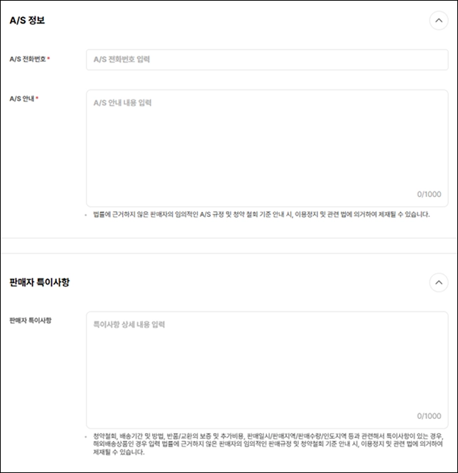A/S 정보란에는 고객 문의 대응이나 교환·반품 관련 안내를 작성해주세요.