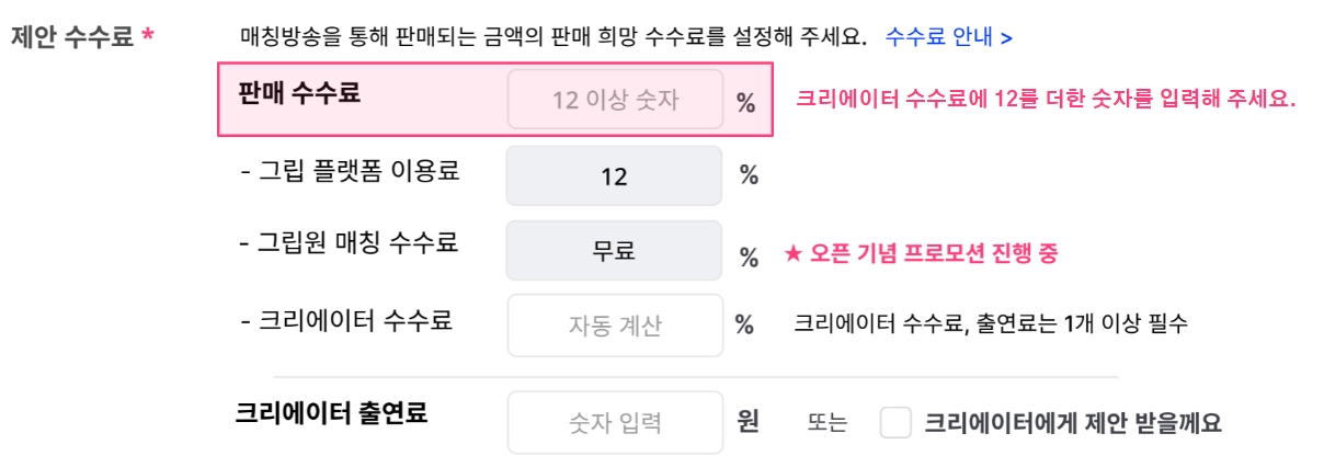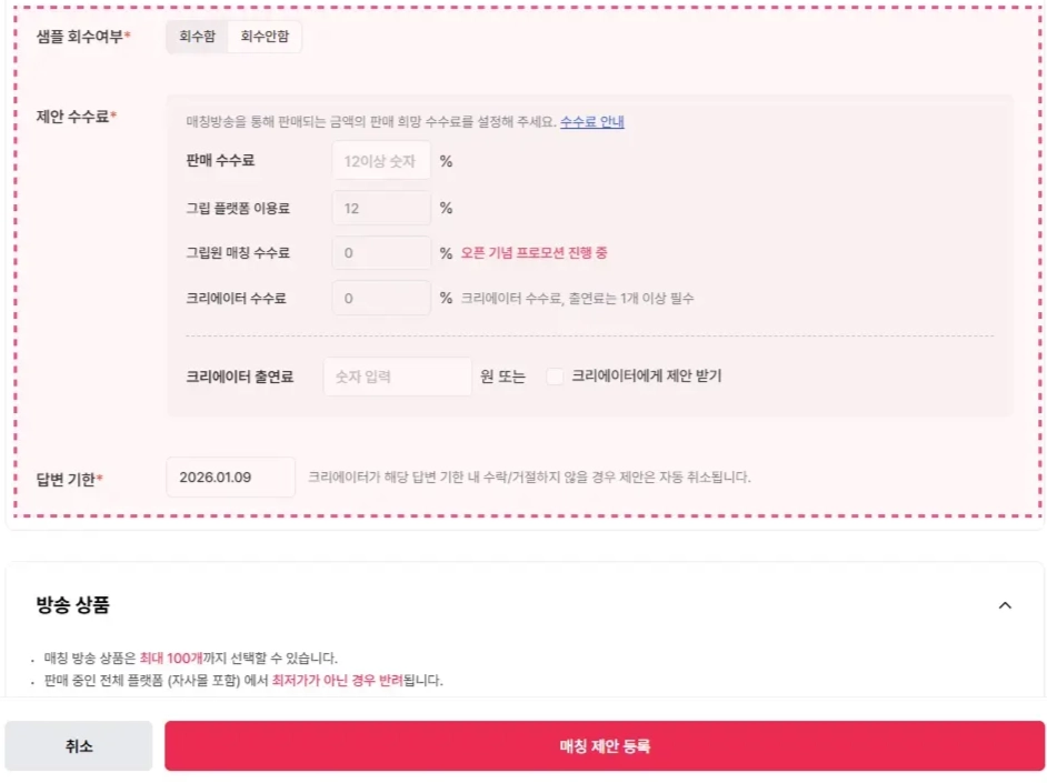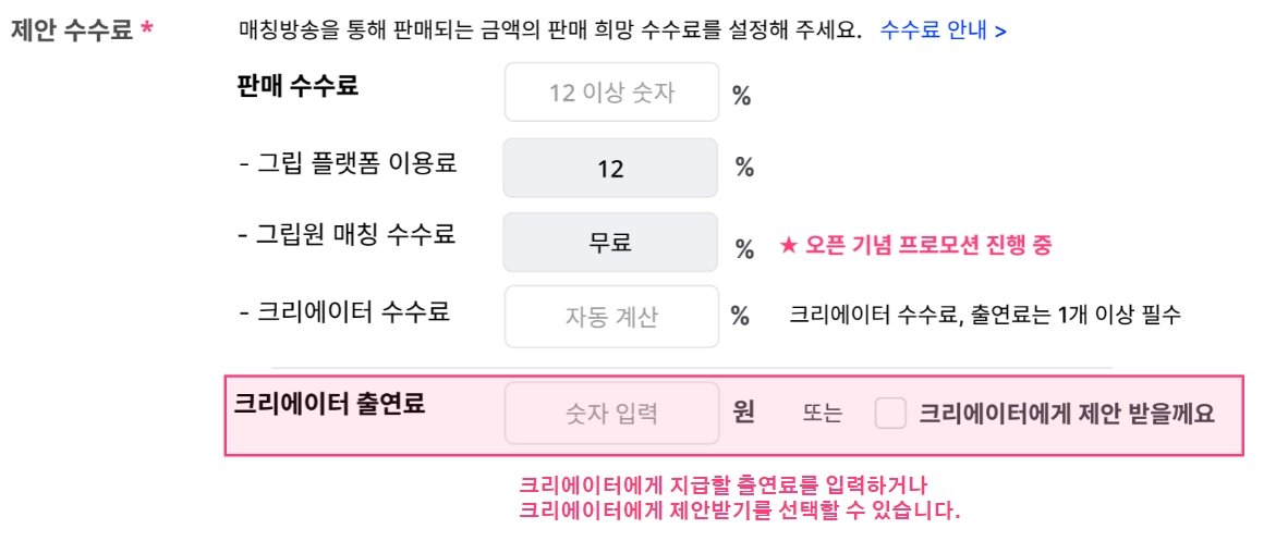 크리에이터에게 출연료를 먼저 제안할 수도 있고, 크리에이터에게 제안받기를 선택할 수도 있습니다.