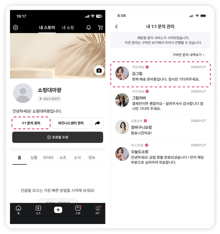 비즈니스센터 > 채널 관리 > 1:1 문의 관리 > 1:1 문의 관리