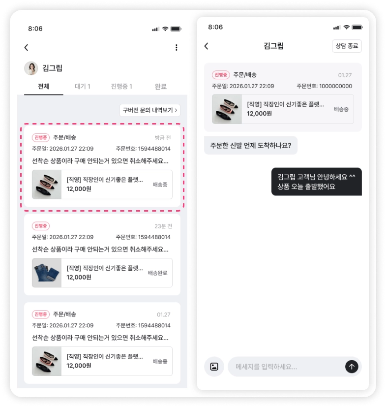 1:1 문의 관리 > 답변할 고객 선택 > 고객 문의 1건 선택하여 응대