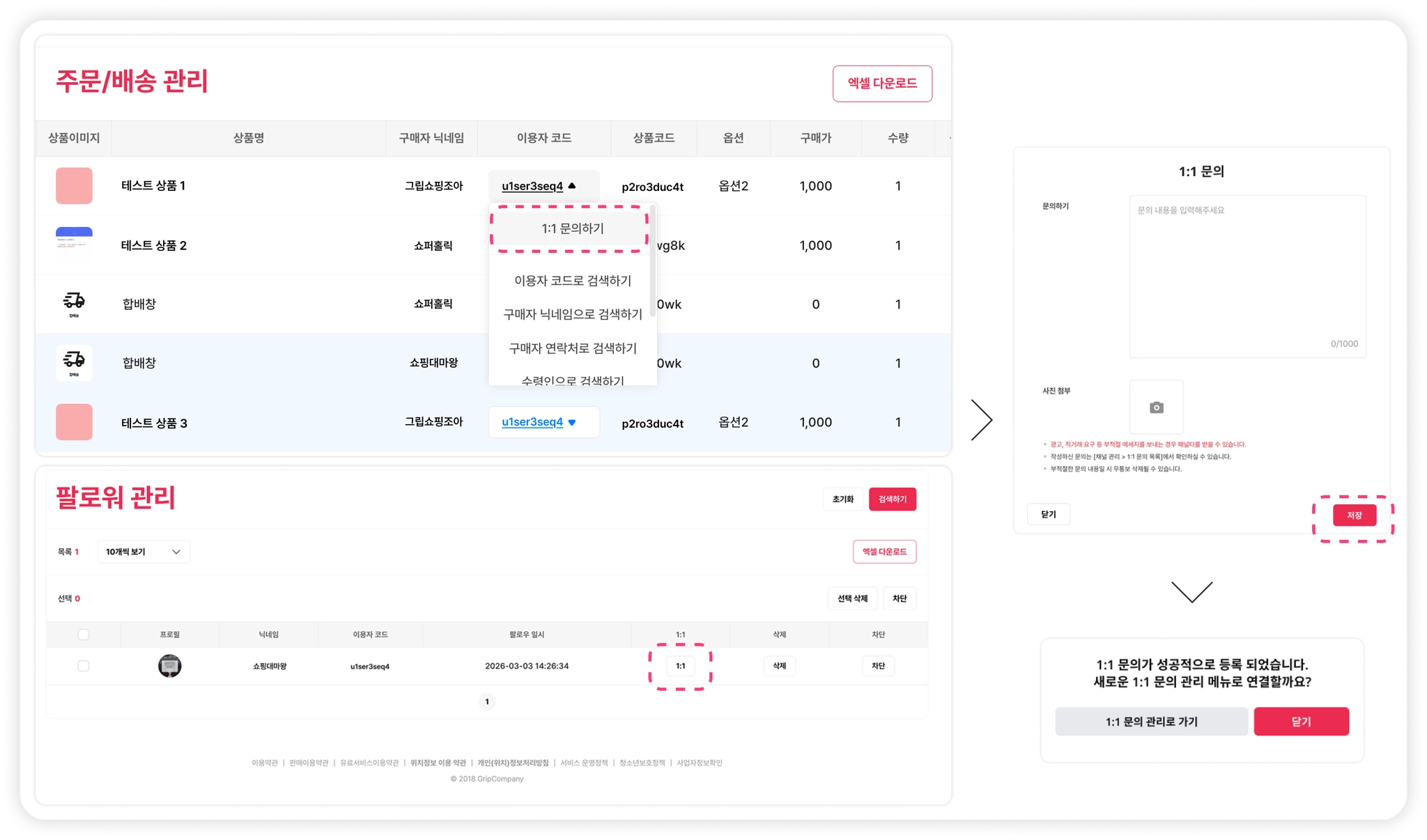 주문/배송 관리 : 주문리스트의 이용자코드 클릭 > 1:1 문의하기