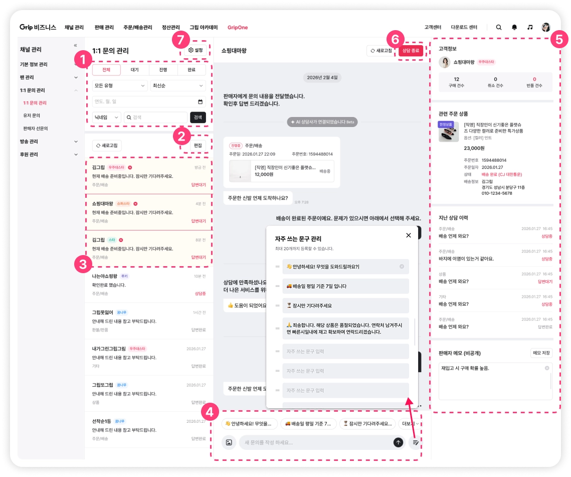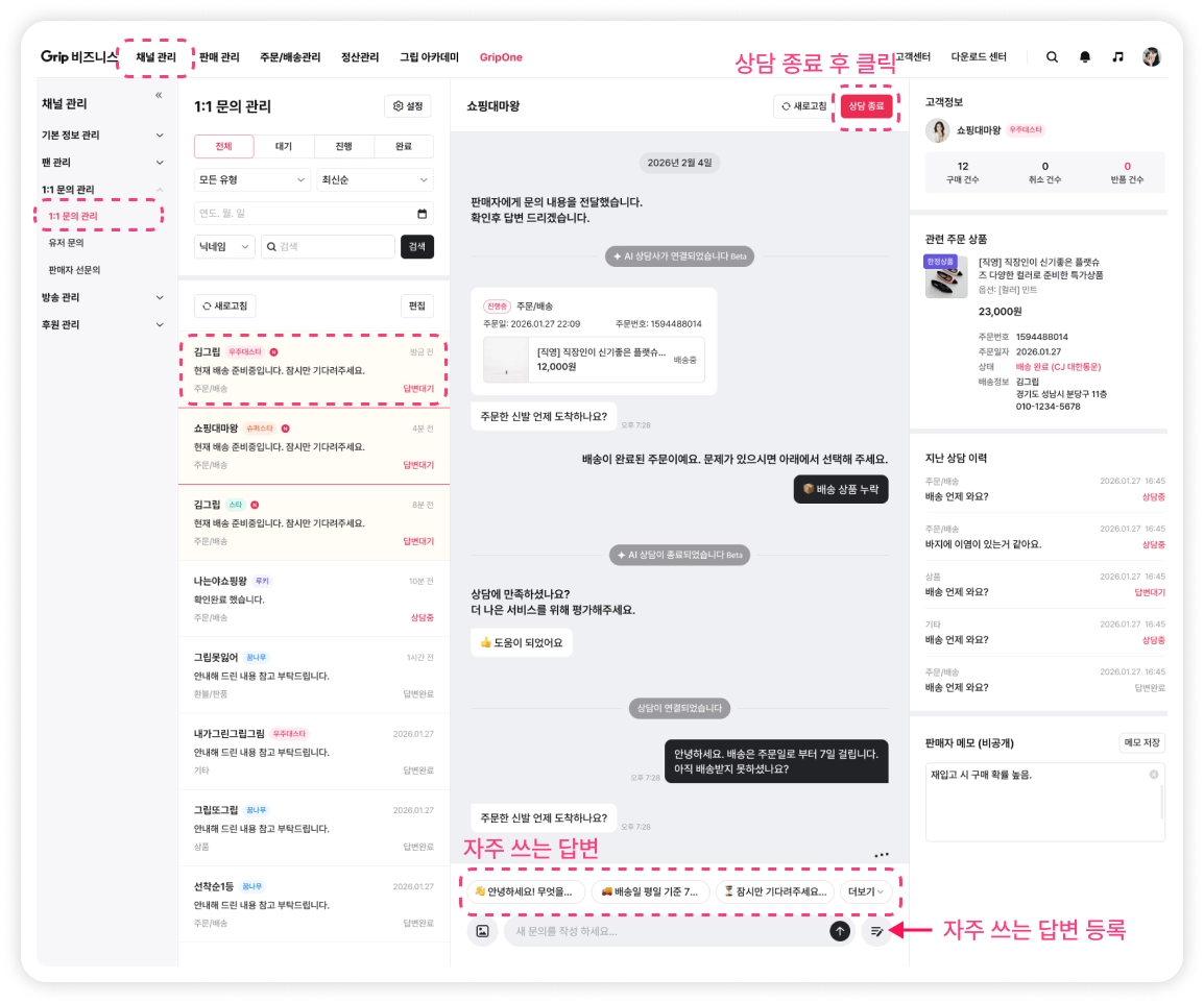 1:1 문의 관리는 현재 PC 웹에서만 이용 가능하며 추후 지원할 예정입니다. 모바일에서는 그립 앱을 이용해 주세요.