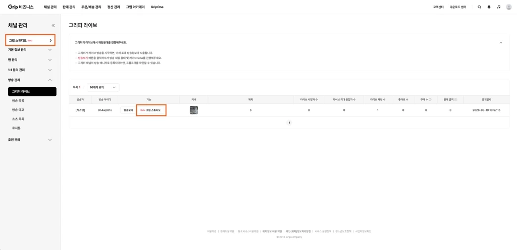 경로: 비즈니스센터 > 채널 관리 > 방송 관리 > 그리퍼 라이브 > [그립 스튜디오] 클릭